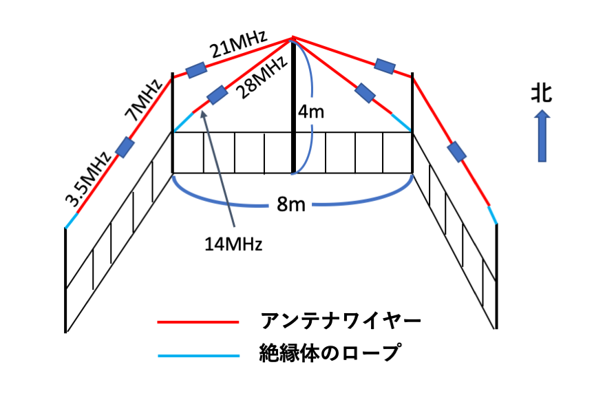 私はアンテナの設営が面倒な年齢になってきましたので、高く張ることはせず、一人で調整や撤去ができるように低くしていました。もちろん打ち上げ角は高くなってしまいますが、やむを得ません。