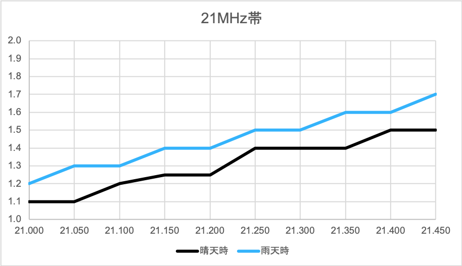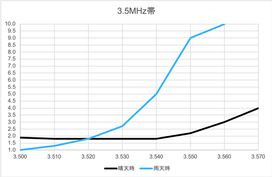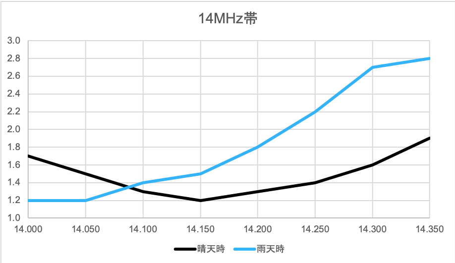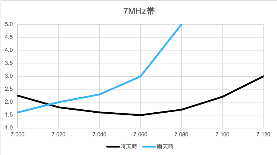 調整した結果、現時点でのSWRはこのようになっています。雨天時は共振周波数が下がります。