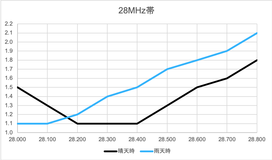 今回はエレメントが低いため、無調整ですと共振周波数は周囲の影響を受けてかなり低くなりました。たとえば7MHzだと6.4MHzあたり、28MHzだと27.3MHzあたりになっていました。このあたりを知るにははアンテナアナライザーがあると便利です。
