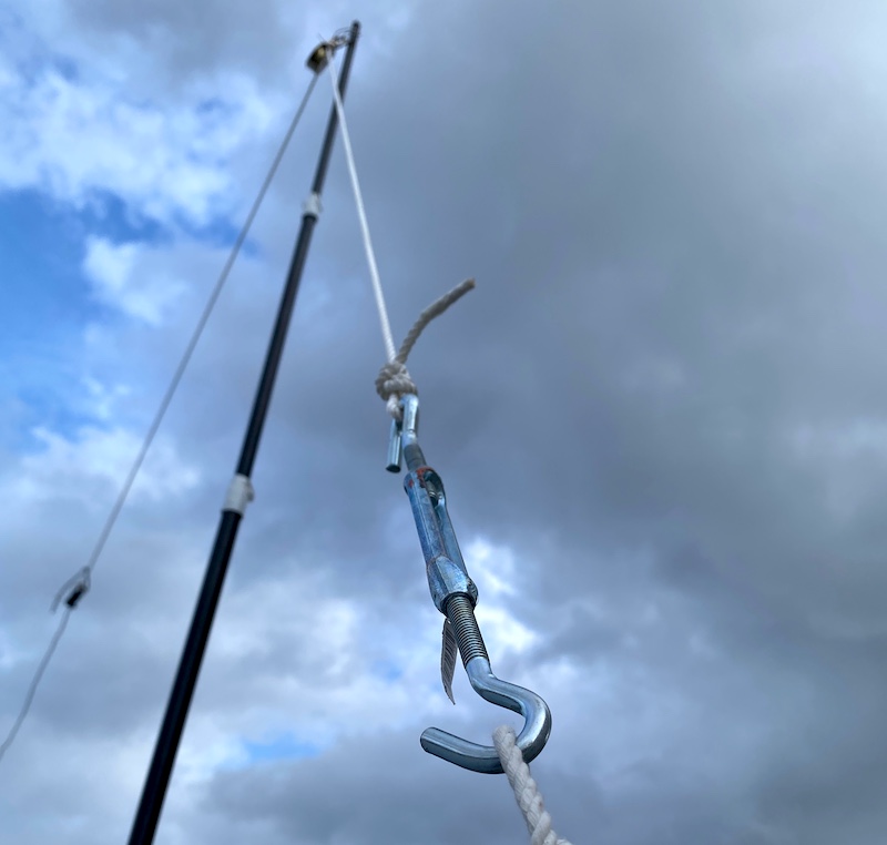 終端のロープにはいずれもターンバックルがついていて、張力調整や取り外しが簡単にできるようにしてあります。